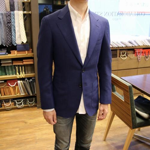 まずは、今シーズンで、COLLABORATION STYLEでオーダーいただくのが3着目のお客様で、今回は、HOP SACKのネイビージャケットの指名買いでございます。1着持っていると、何かと重宝するジャケットですね!