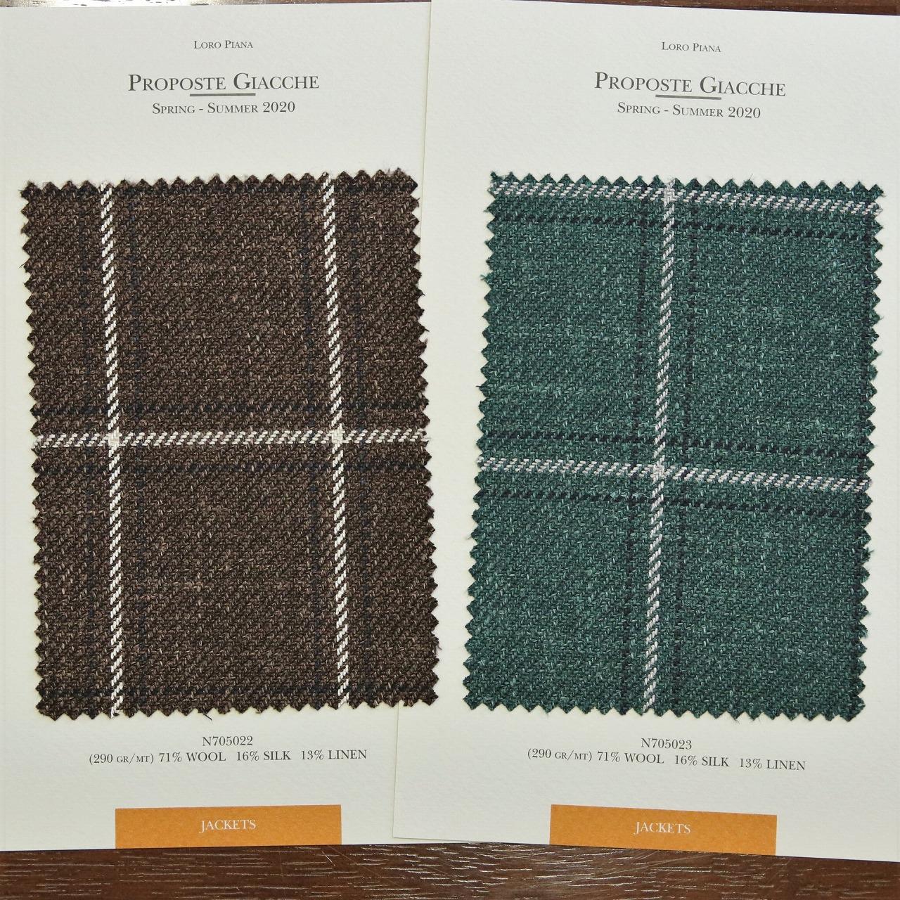 LORO PIANAのウール・シルク・リネンのサマーツイードは、1シーズンコレクションのPROPOSTE GIACCHEに毎年、色柄を変えながら10色前後展開されている生地で、その中から少し青みかかったグリーンのチェック柄を選んでいただきました。