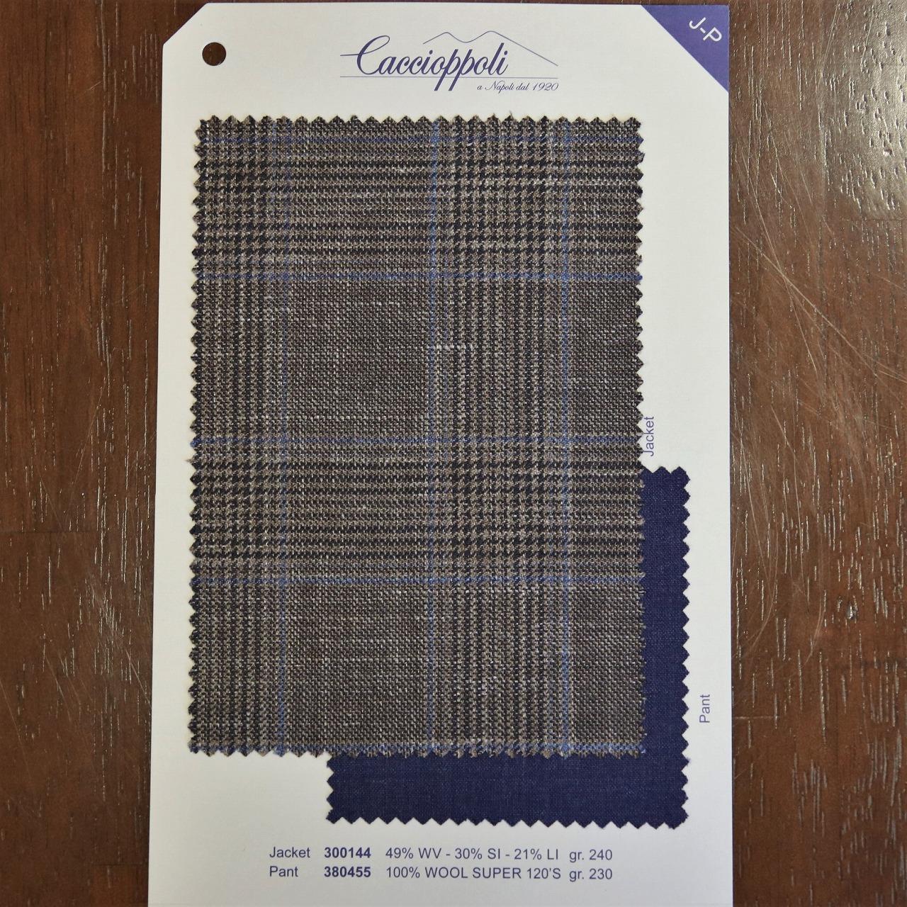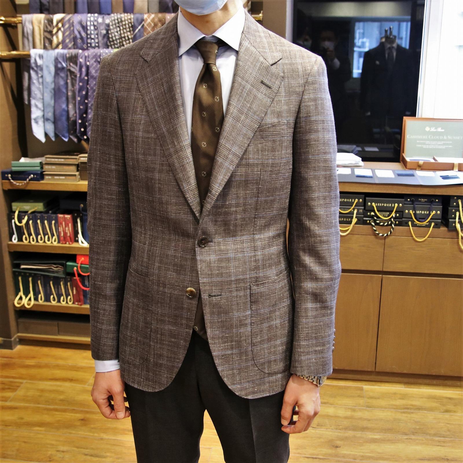 ジャケットで選んだ生地は、CACCIOPPOLIの49%WOOL・30%SILK・21%LINENのブラウンのチェックでございます。