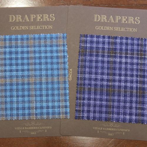 今回選んでいただきました柄を含めて、今シーズン、DRAPERSのGOLDEN SELECTIONには、12種類のウール&シルクのホップサックの生地が収録されていますが、チェック柄も無地も非常に発色がきれいで、光沢のある生地でございます。