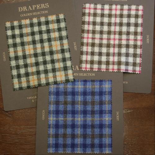 続いてのジャケット生地は、DRAPERSのジャケット生地では定番のクオリティで、90%WOOL&10%CASHMEREでございます。目付は、300g/mと使いやすく、色柄の発色がとてもきれいなコレクションでございます。