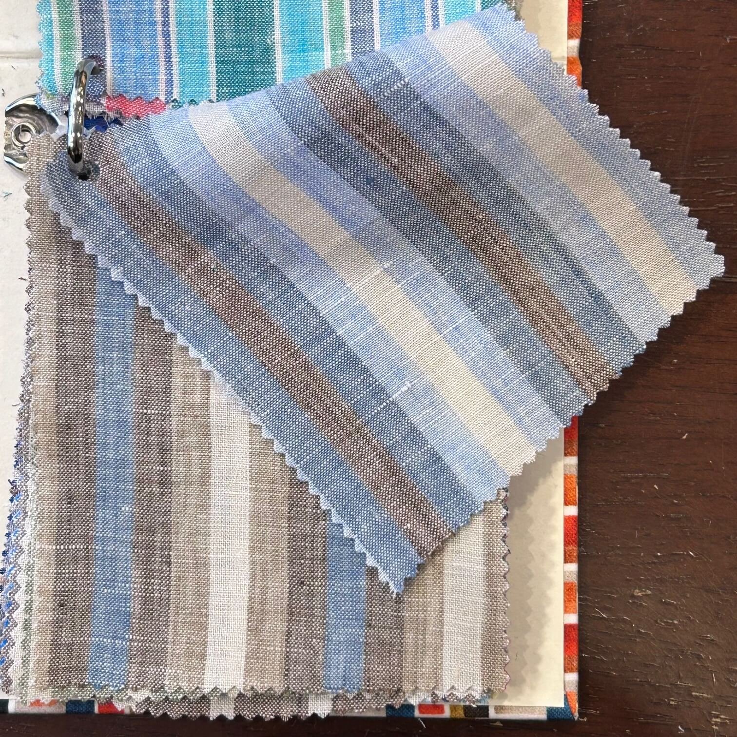 国内の生地商社では、100%LINENの生地は無地のコレクションが圧倒的に多いですが、これだけ色を使ったストライプやチェック柄を揃えているのは、本当にさすがです!