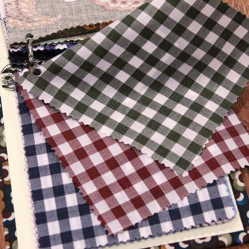 続いての生地は、先程ご紹介しました100番手双糸のツイルよりも少し厚みのある100番手双糸のツイルで、秋色のタッタソールやギンガムチェック、ハウンドトゥースでございます。
