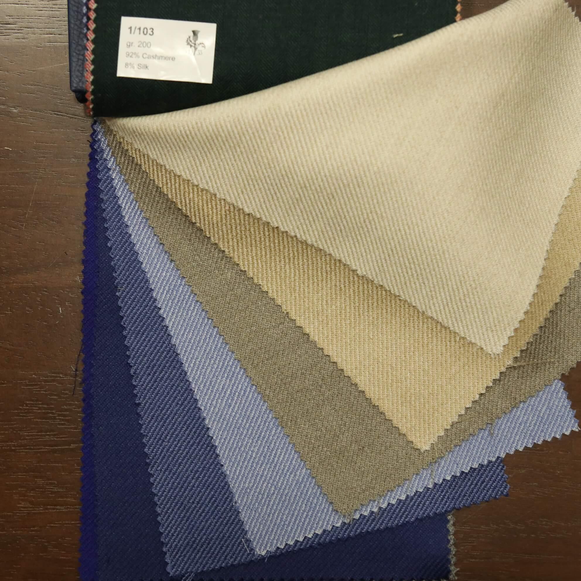 まずは、60%CASHMERE,32%SILK&8%LINENで、目付が170~190g/mのかなり軽いツイル(綾織り)の生地でございます!