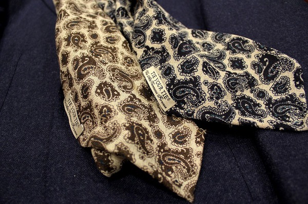 TIE YOUR TIE ではシルクプリントのつるっとした生地でのセッテピエゲはとても人気です。私の知る限りシルクプリントで芯無しのセッテピエゲを作っているブランドはほとんど無いと思います。しかも、今回のコレクションは、タンブラー加工という、いわゆる生地の段階でウォッシュ加工のようなものを施しているので、さらに柔らかくトゥルントゥルンです。色も少しマットになり、ヴィンテージ感も出ています。