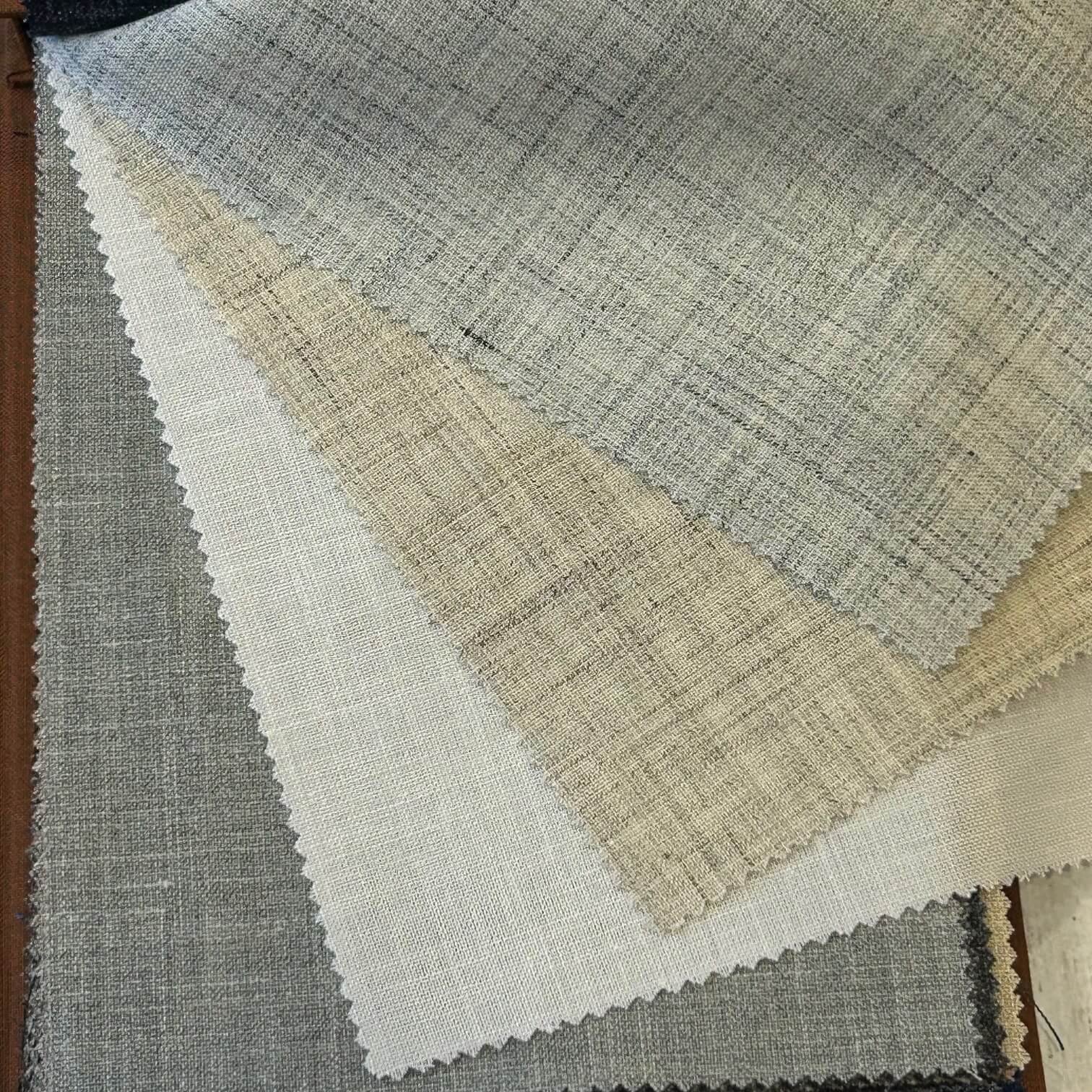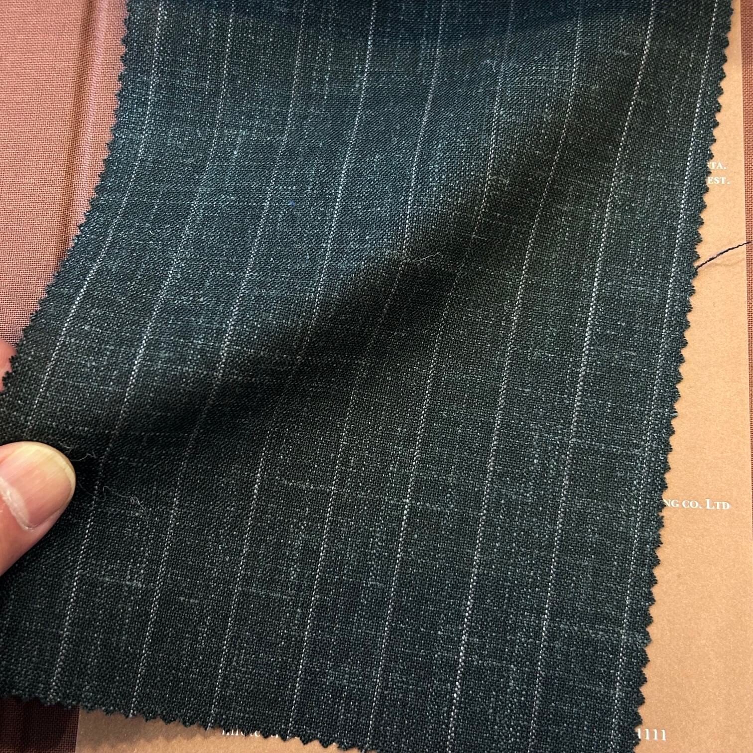 この生地の特徴としましては、夏に欠かせない清涼感あふれるリネンとナチュラルに通気性とシワに対する回復力といった機能性に優れるウールに上品な光沢のシルクを巧みに組み合わせた素材で、ハイツイストの糸で織っている為、リネンブレンドでありながらも皺になり難く、スーツやジャケットだけではなく、単品のパンツでも快適な素材です。また、リラックスしたカジュアルなセットアップスーツにも相性の良い生地でございます。