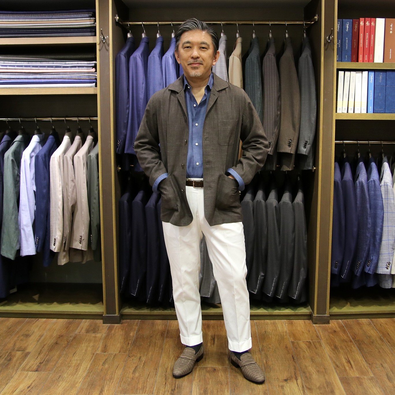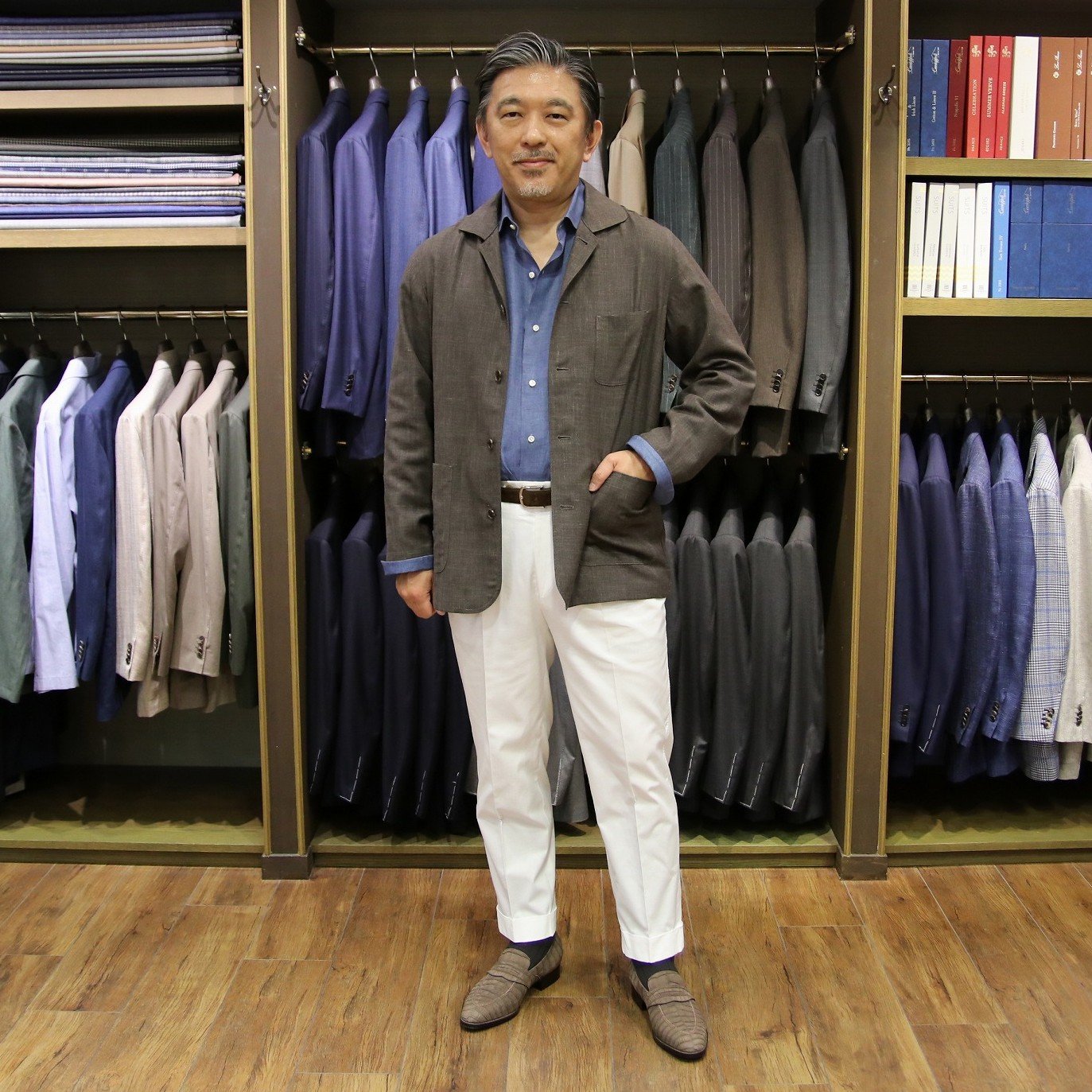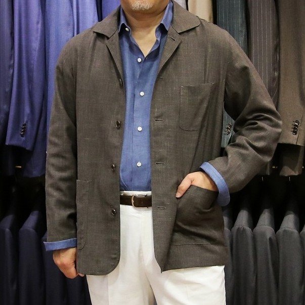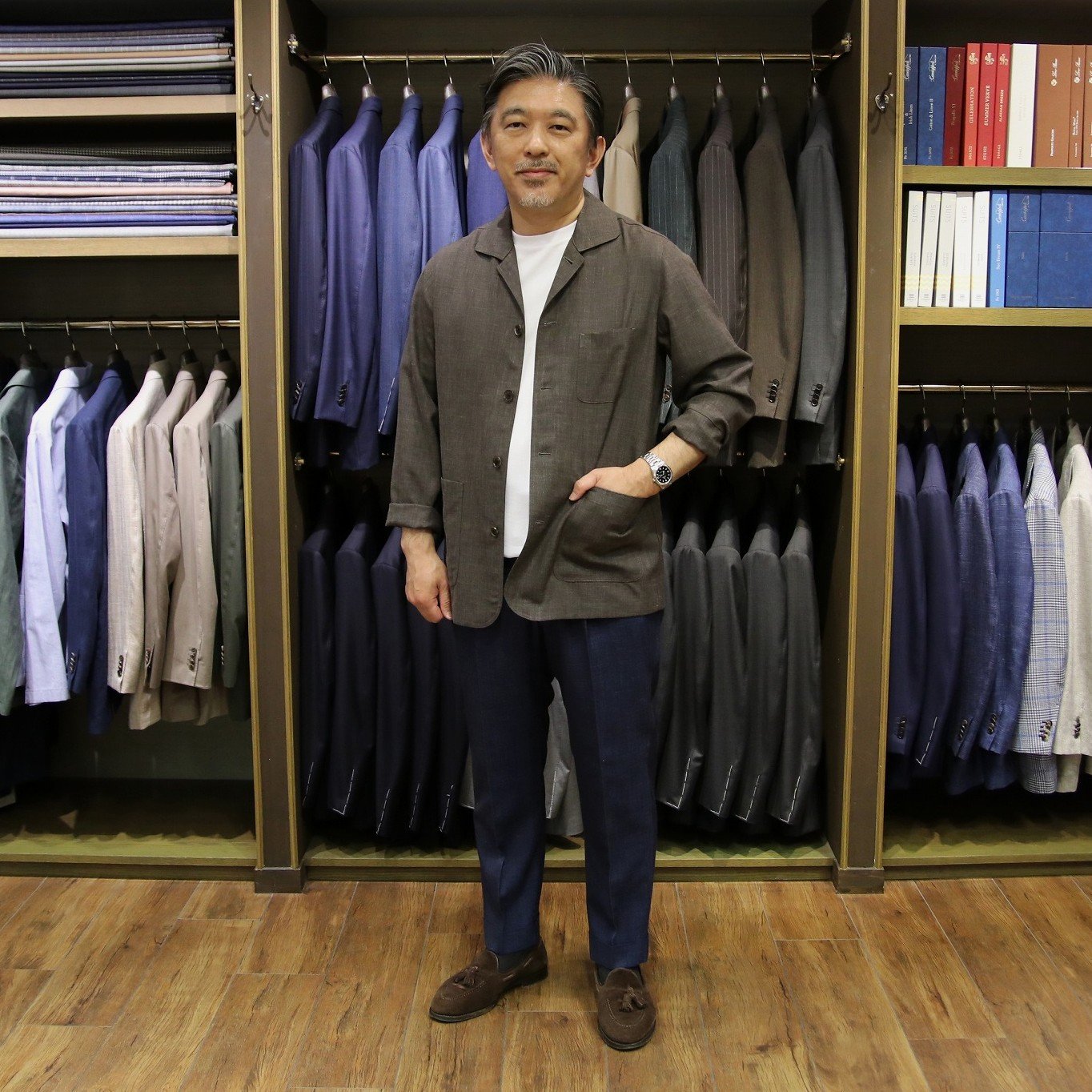 そして、実は今シーズン、スーツの他にも、COLLABORATION STYLEのショップストックに隠れていたSUMMERTIMEのブラウンで、チョアジャケットを作ってみました!