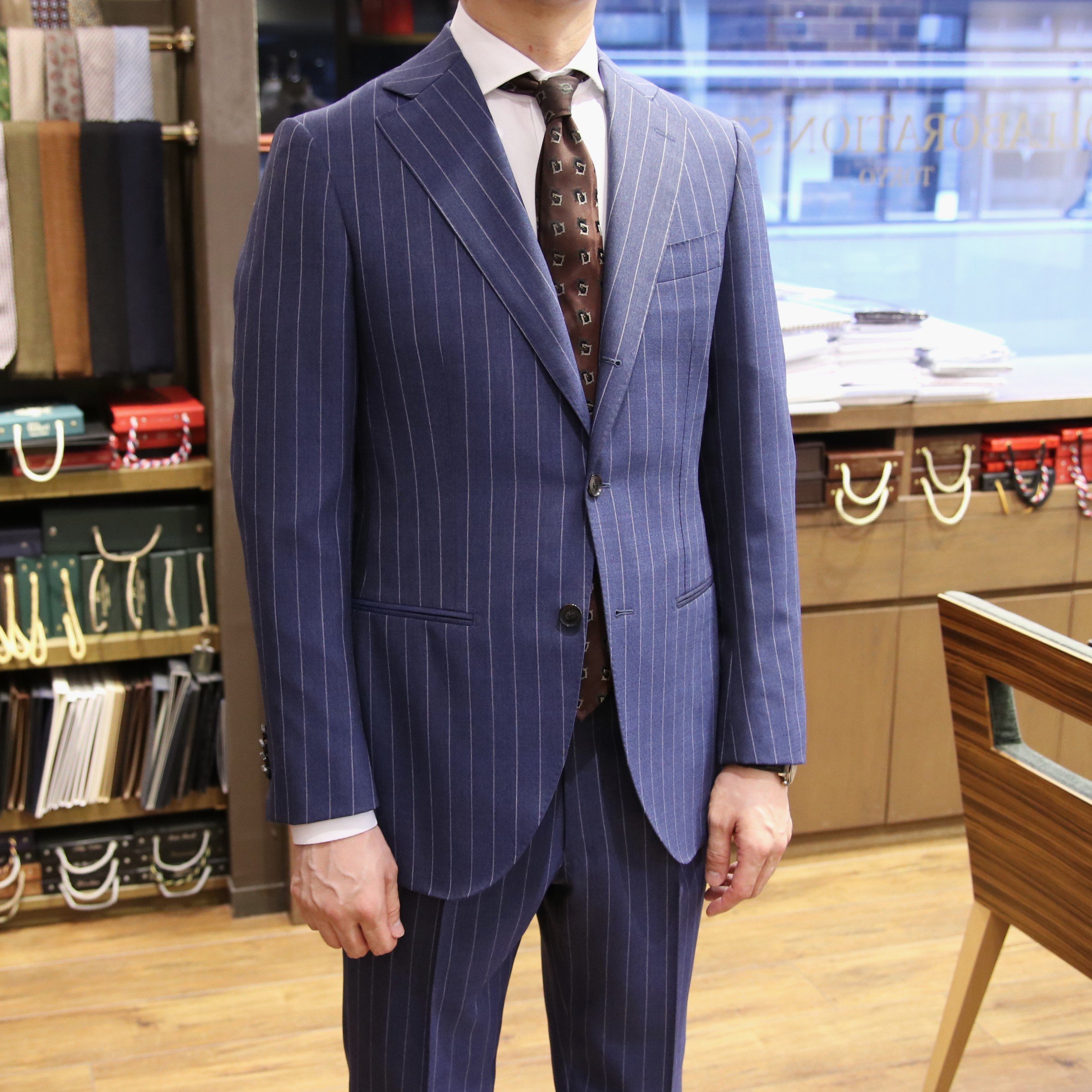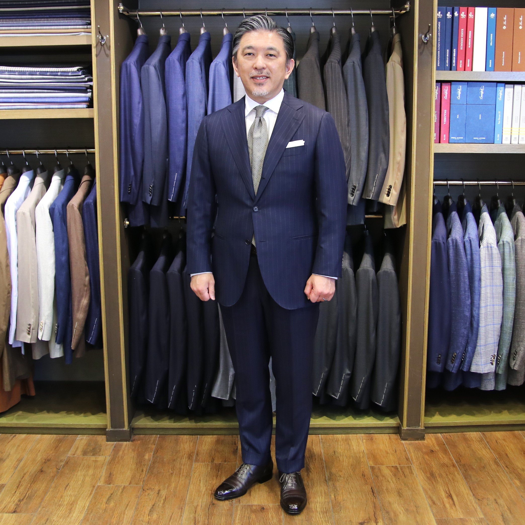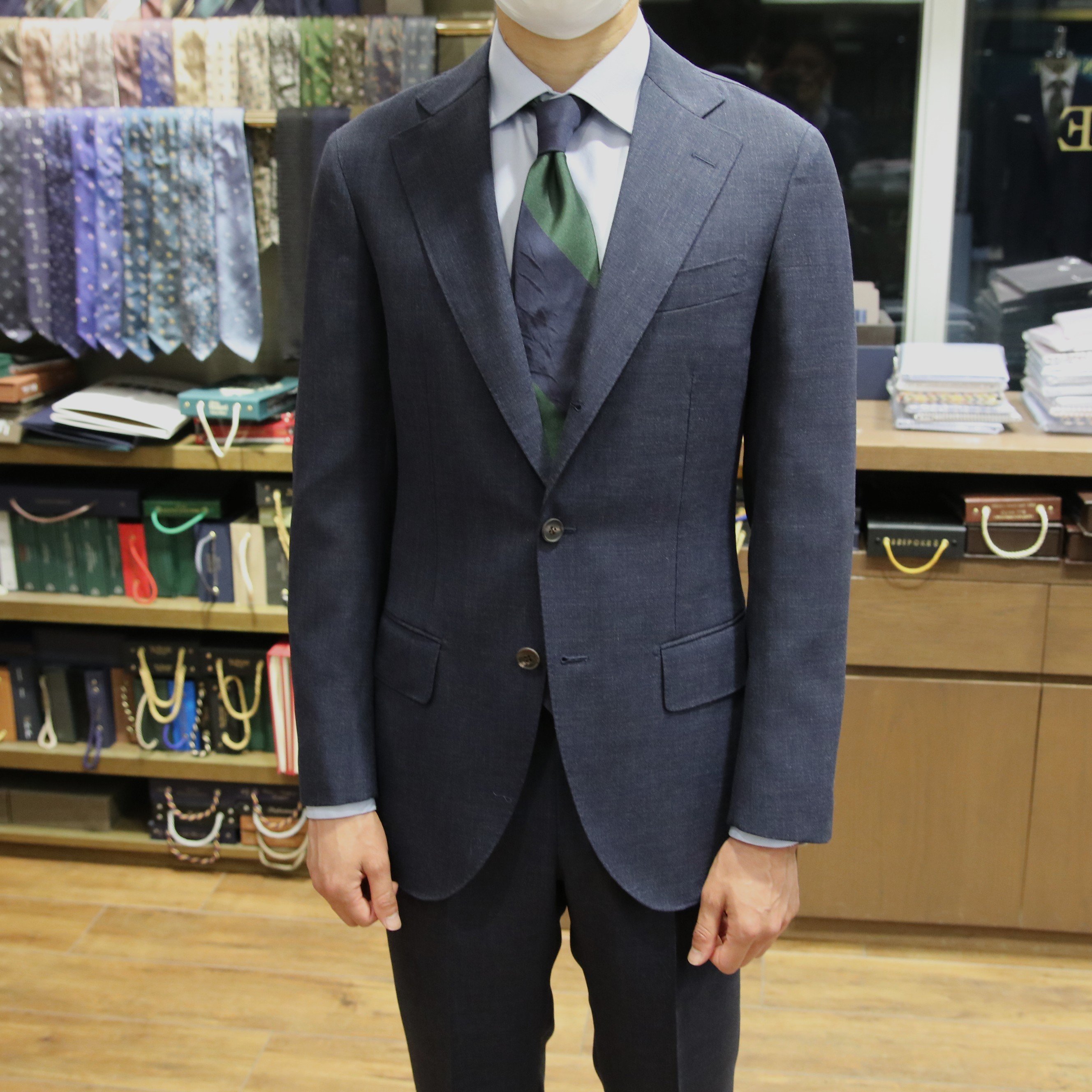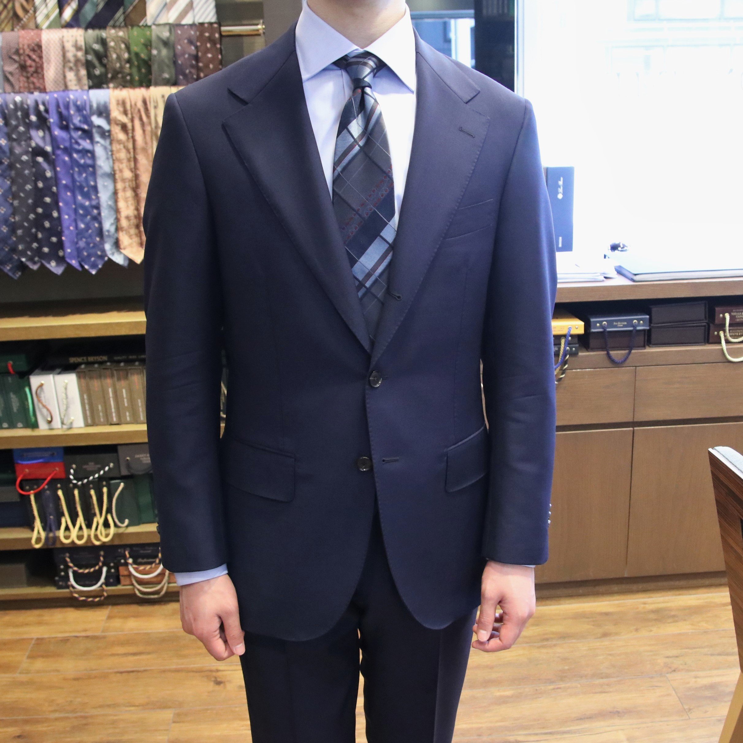 ショップには、今回ご紹介しました生地を含め、色柄豊富にたくさんの夏用スーツ生地をご用意しております。また、夏の生地で仕立てたスーツも多数展示しておりますので、実際に手に取って比較しながらご覧いただけます。