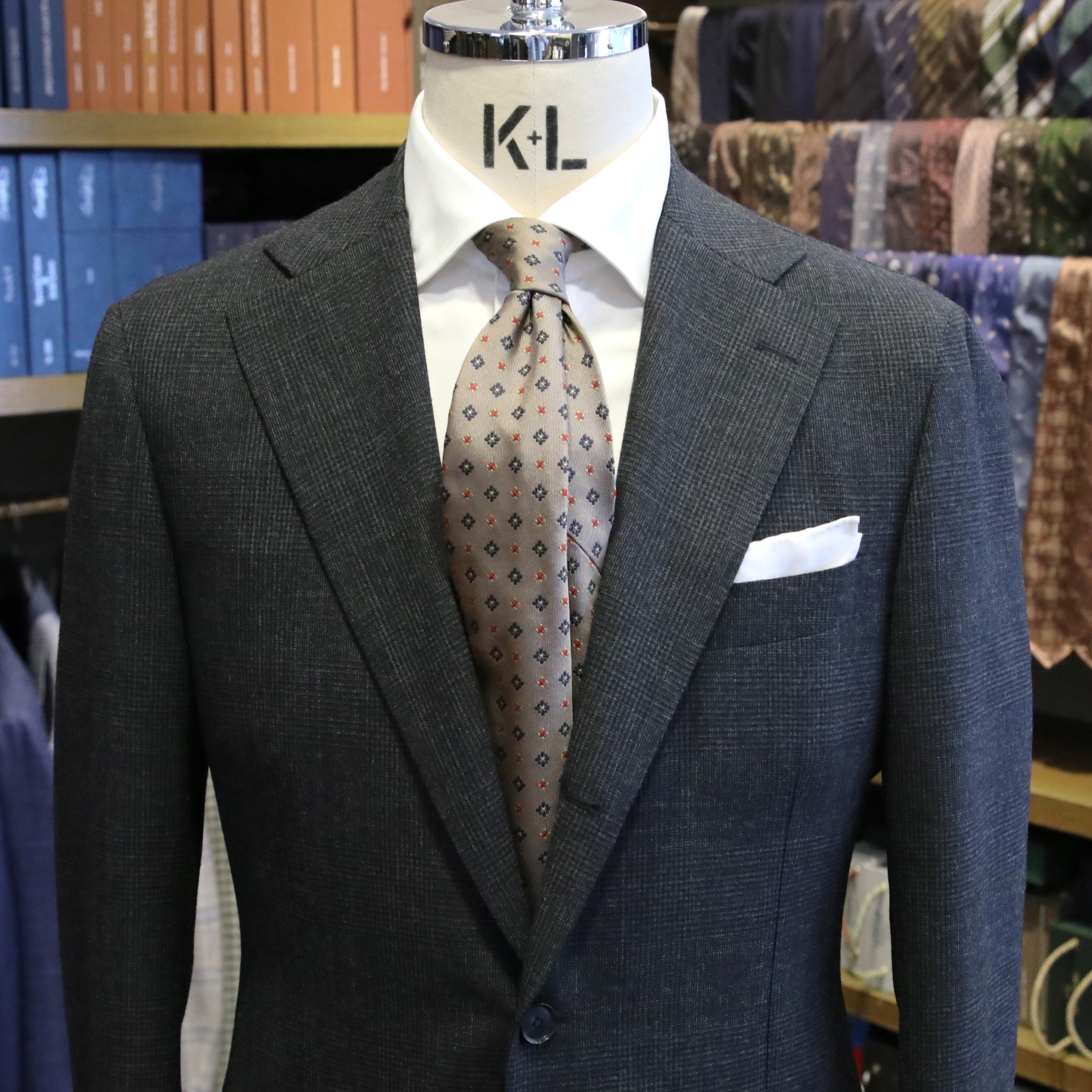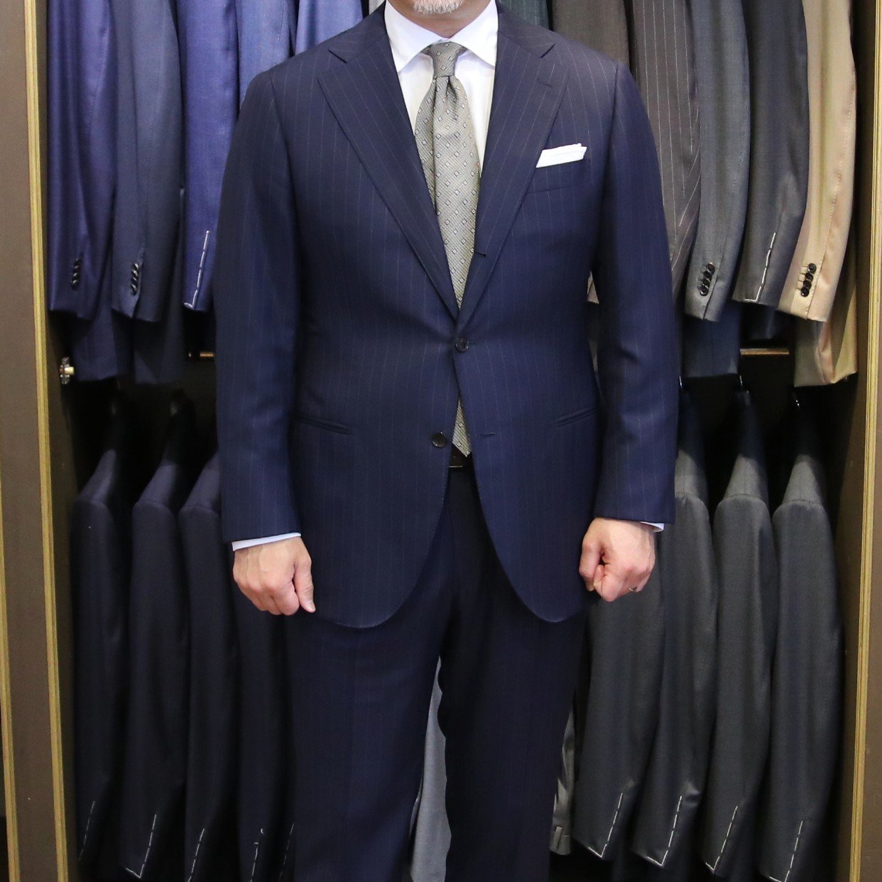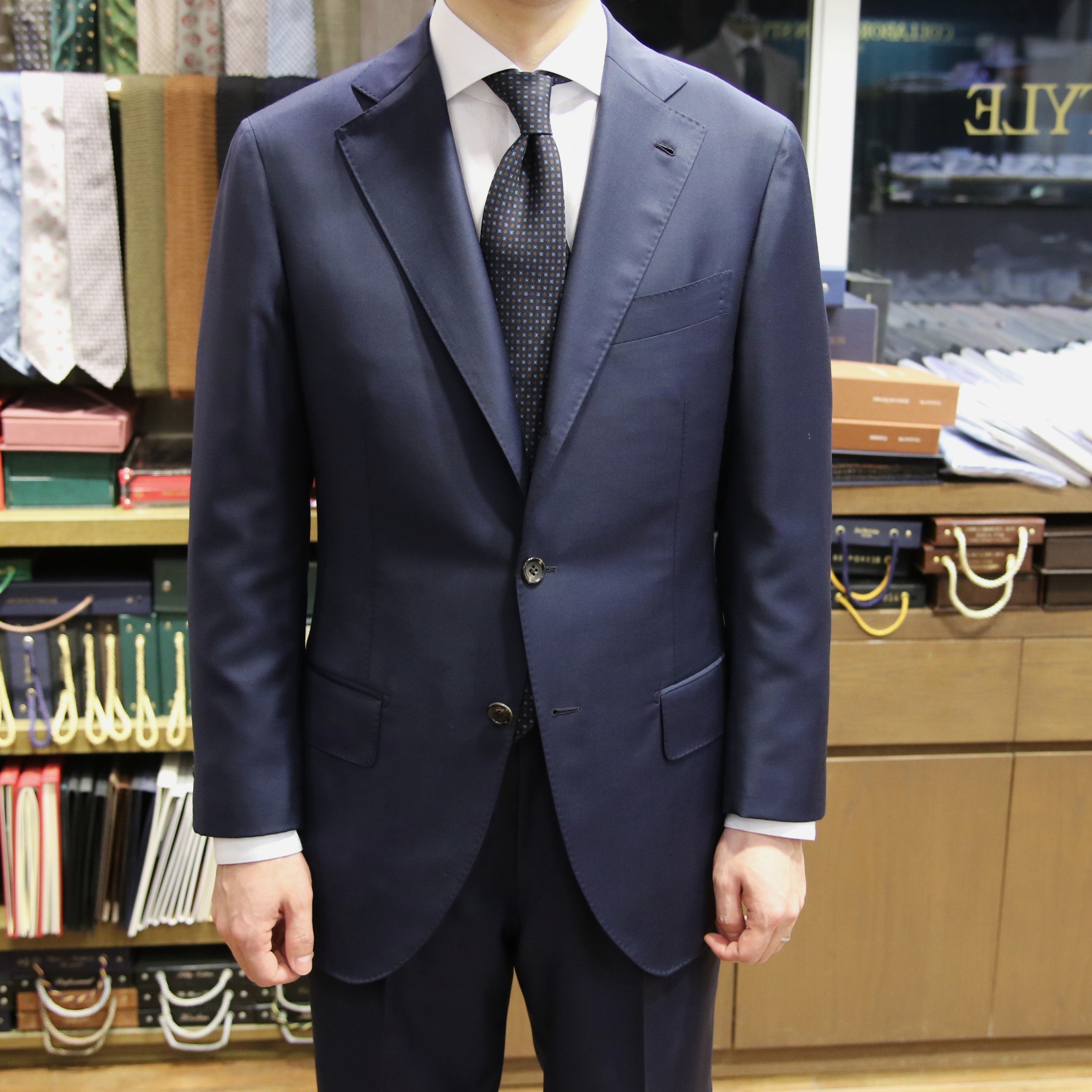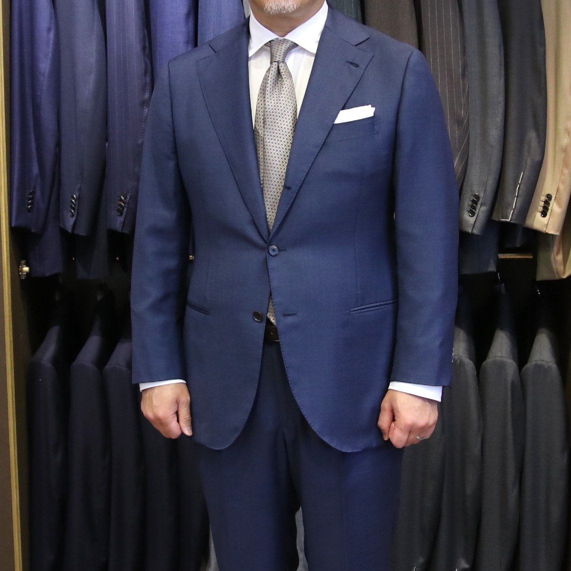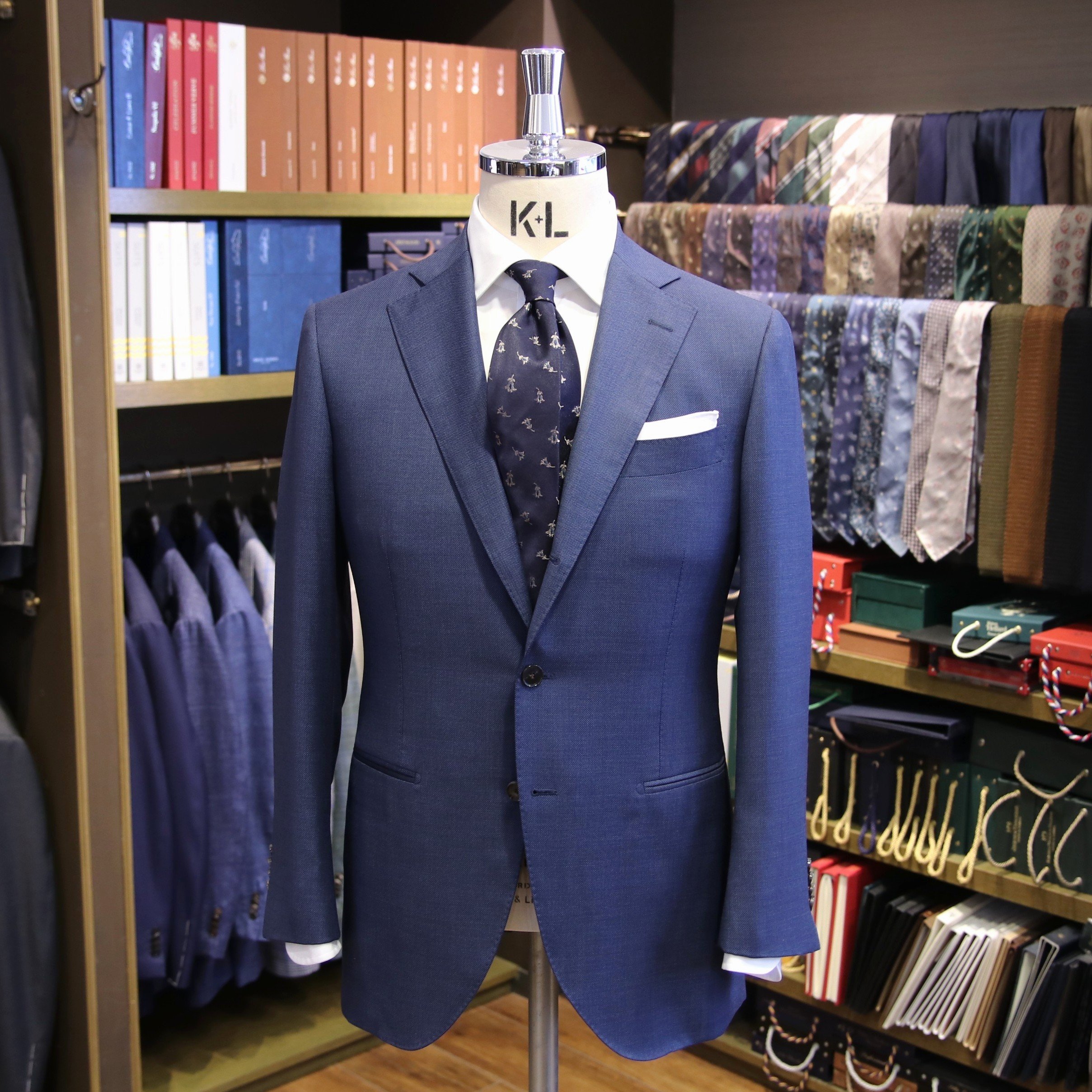 ショップには、今回ご紹介しました生地を含め、色柄豊富にたくさんの夏用スーツ生地をご用意しております。また、夏の生地で仕立てたスーツも多数展示しておりますので、実際に手に取って比較しながらご覧いただけます。