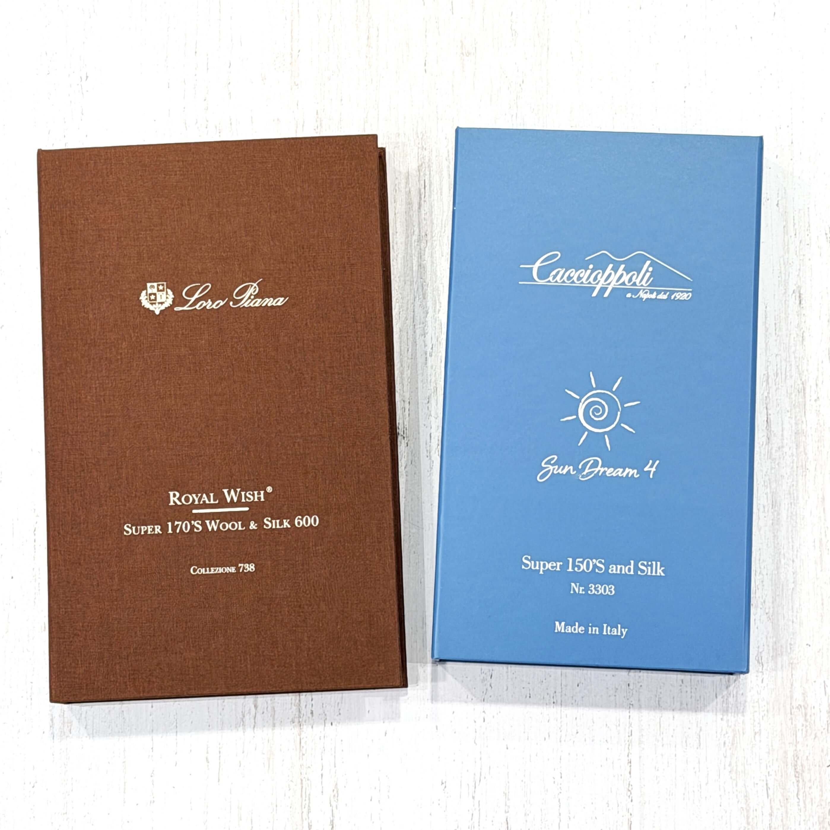 COLLBORATION STYLEでも人気の高い代表的なウール・シルクの生地は、LORO PIANAのROYAL WISH®とCACCIOPPOLIのSUNDREAMでございます。![]()