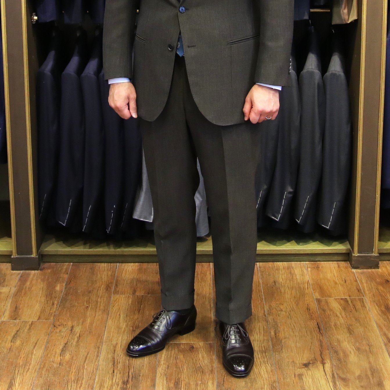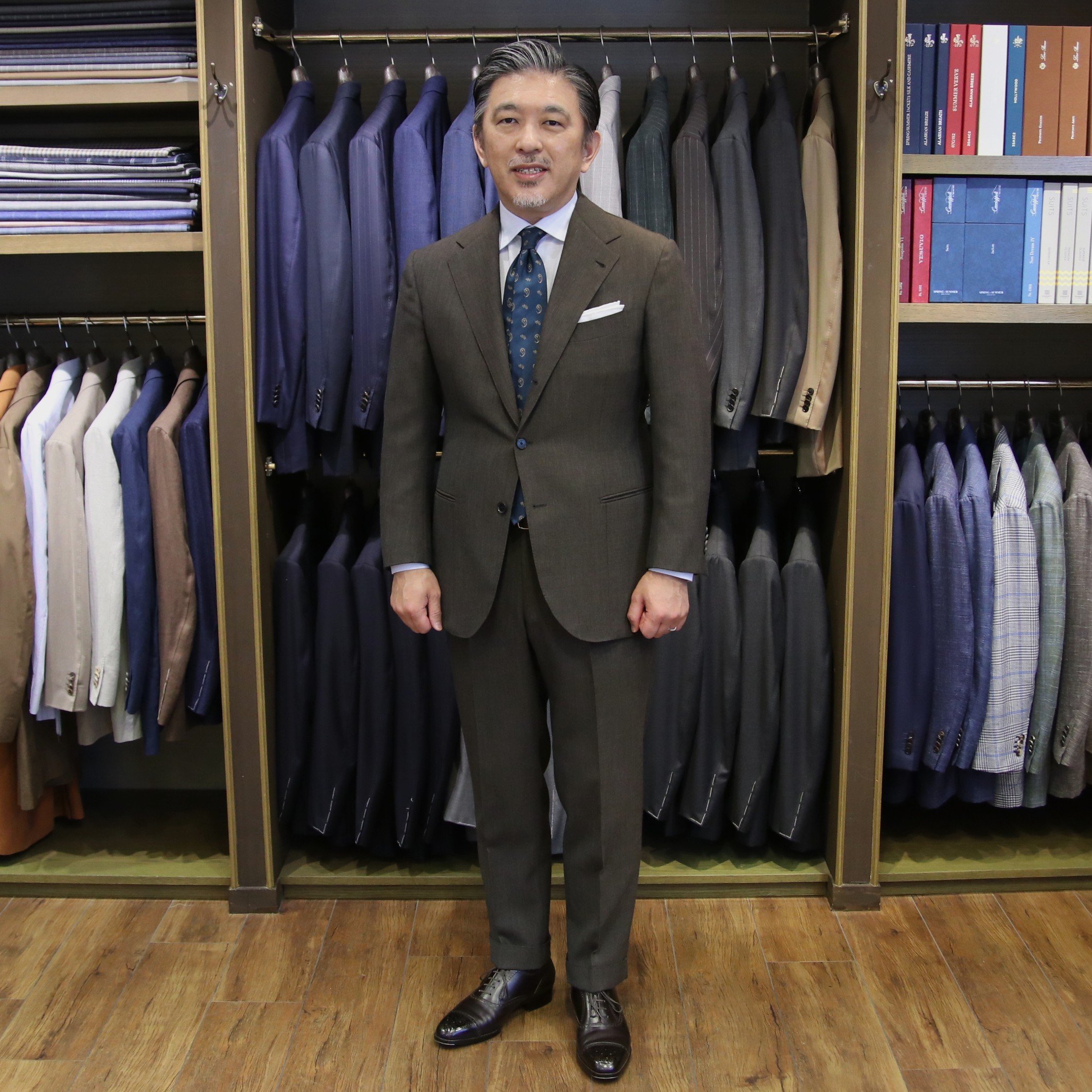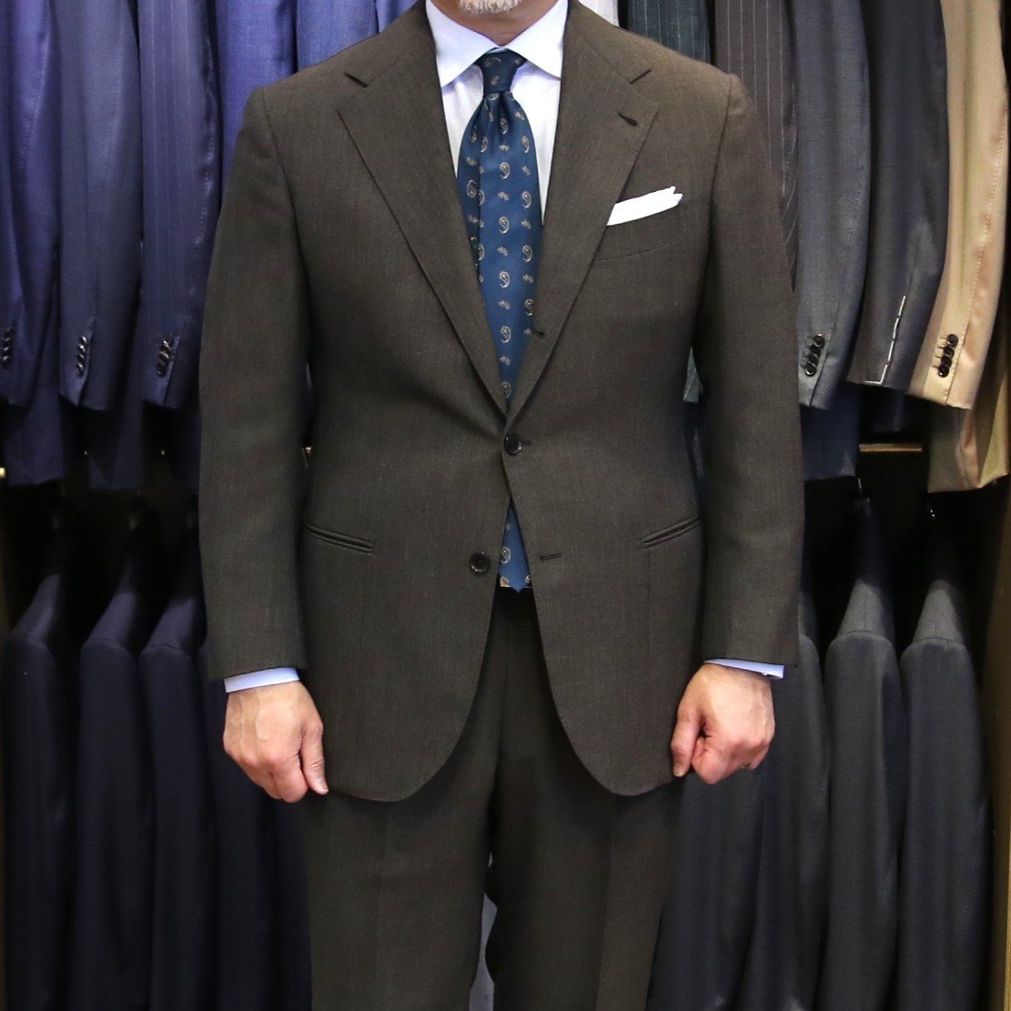 私が2024年にPURPLE LABELのセカンドサンプルとして仕立てたブラウンのスーツです。糸が太くしっかりとした生地なので、汗かきの私でも型崩れせずに立体感が持続し、とても気に入っている1着です。