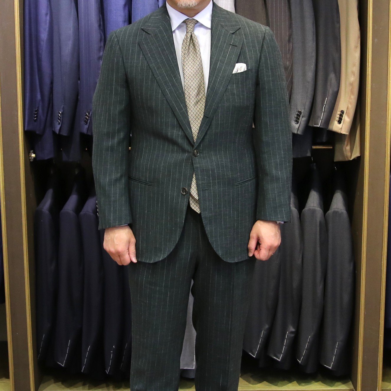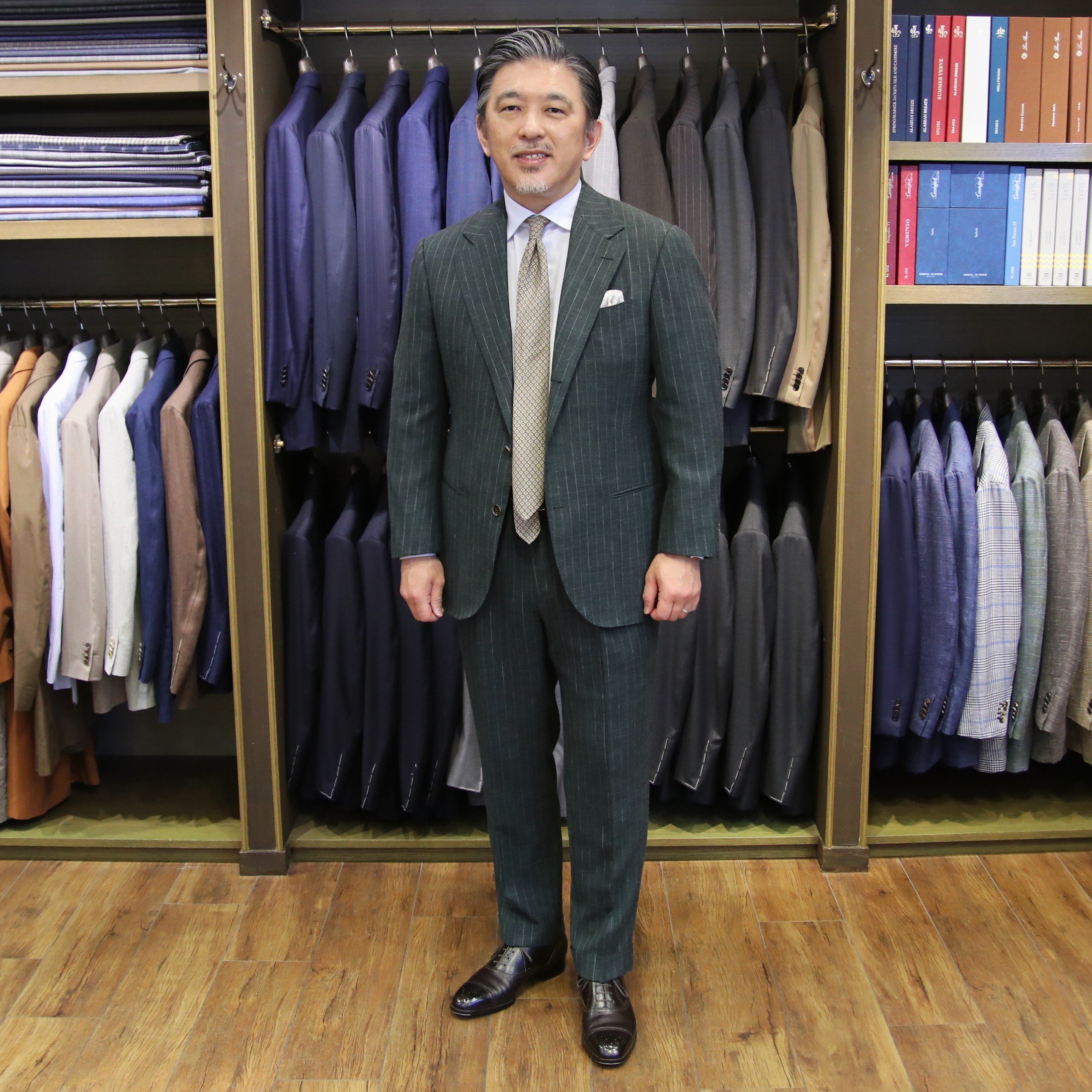 2025年にグリーンのストライプで仕立てたスーツです。