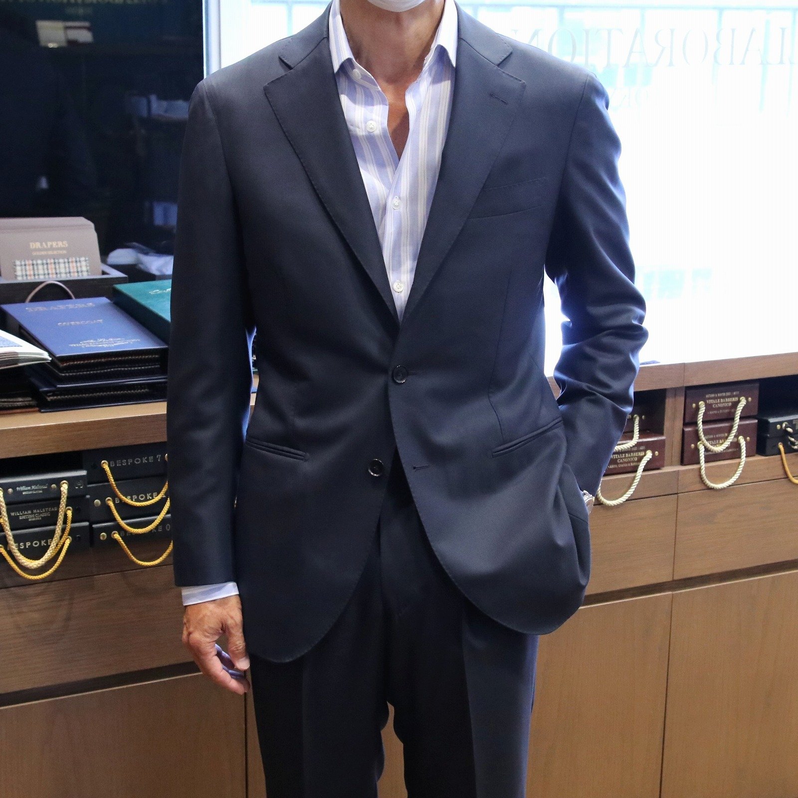 株主総会用としてLORO PIANAのTASMANIAN®のネイビー無地で仕立てたスーツ