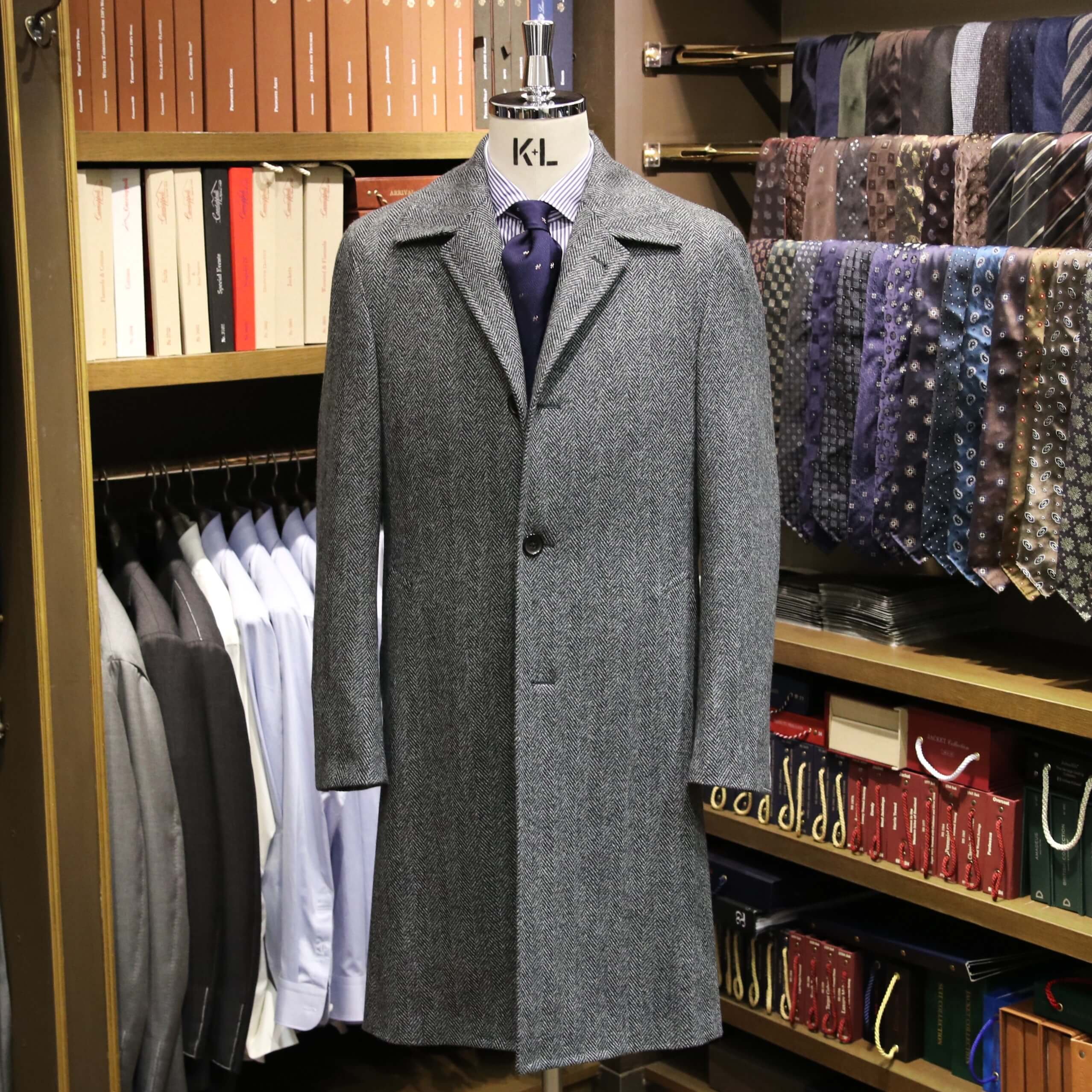 ビジネスシーンメインで着るコートとしてのオーダーいただきましたので、クラシックなスーツとAtto Vannucciの小紋のネクタイで、シンプルにコーディネート。レイダウンバルカラーは、ネクタイがきれいに見えるので、タイドアップも格好良です。