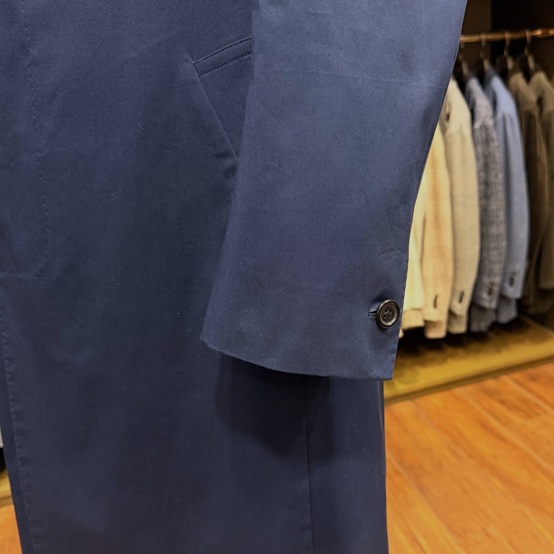LORO PIANAのウール・ナイロンのRAIN SYSTEM®(撥水加工)でオーダーいただきましたバルカラーコートSUPER150'Sのウールとナイロンをブレンドした軽く、シワにも成り難い上質な機能素材です。グレイッシュなブルーもLORO PIANAらしい絶妙な色でございます。フロントは比翼で、袖口はボタン無しの筒袖で仕上げています。