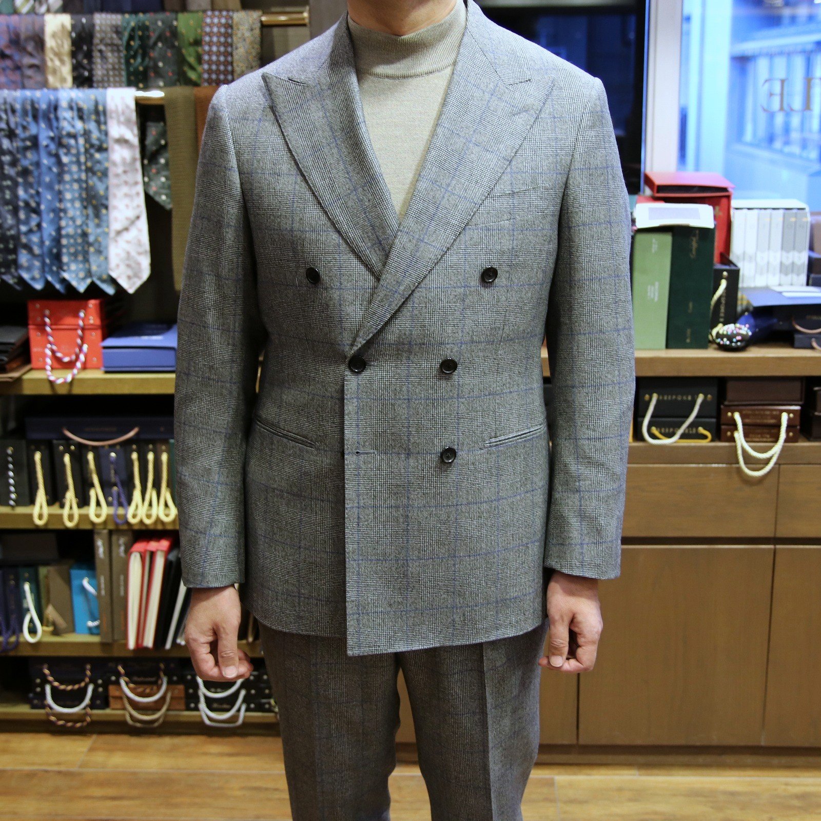 続いては、CACCIOPPOLI(カチョッポリ)から、グレーのグレンチェックにブルーのオーバーペーンが入ったフランネルらしい柄でオーダーいただいたダブルスーツです。