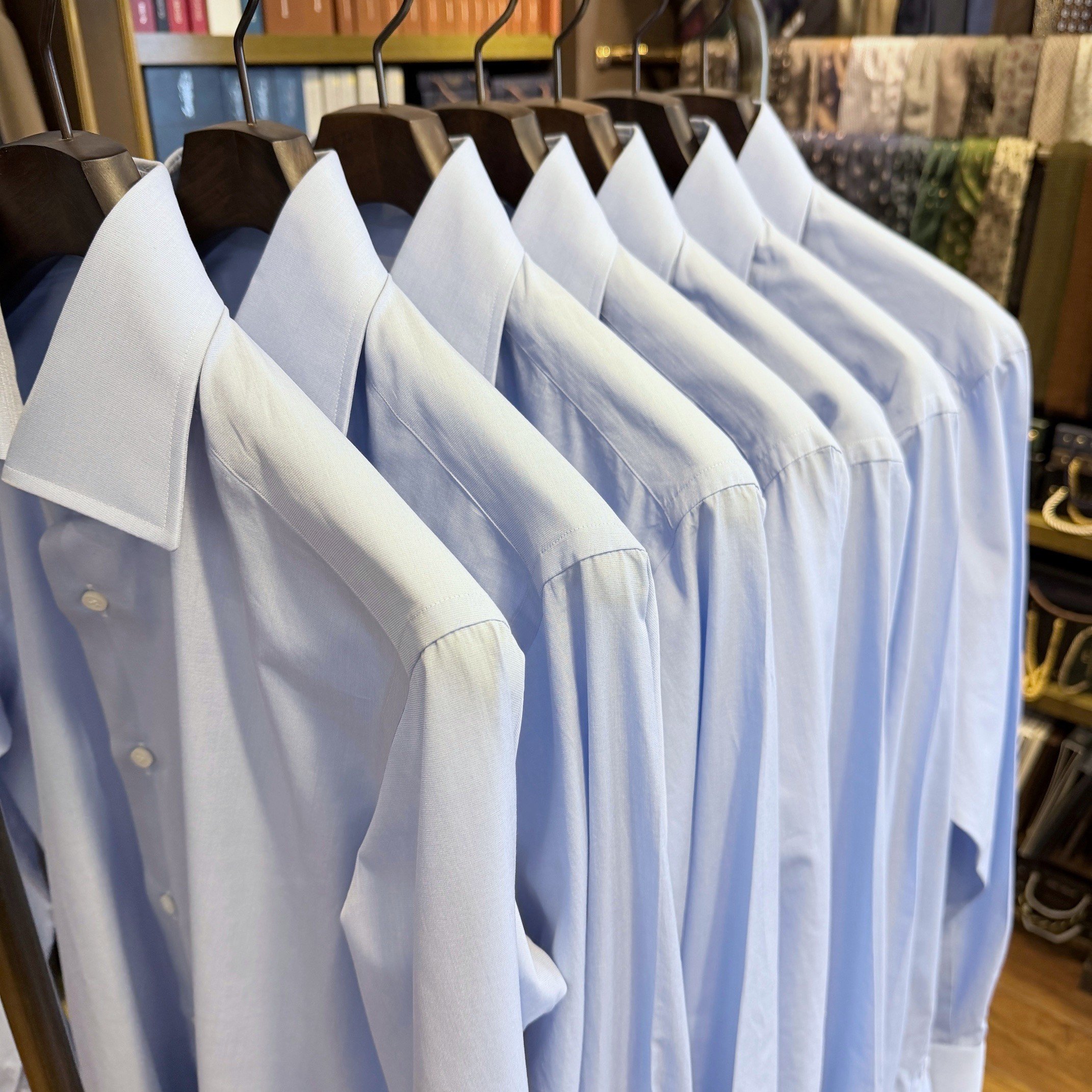 ショップには、私がいろいろな生地と仕様で仕立てたシャツを多数展示しております。実際に見て触っていただきながらご相談承りますので、いつでもお気軽にお電話又はメールでお問い合わせください。
