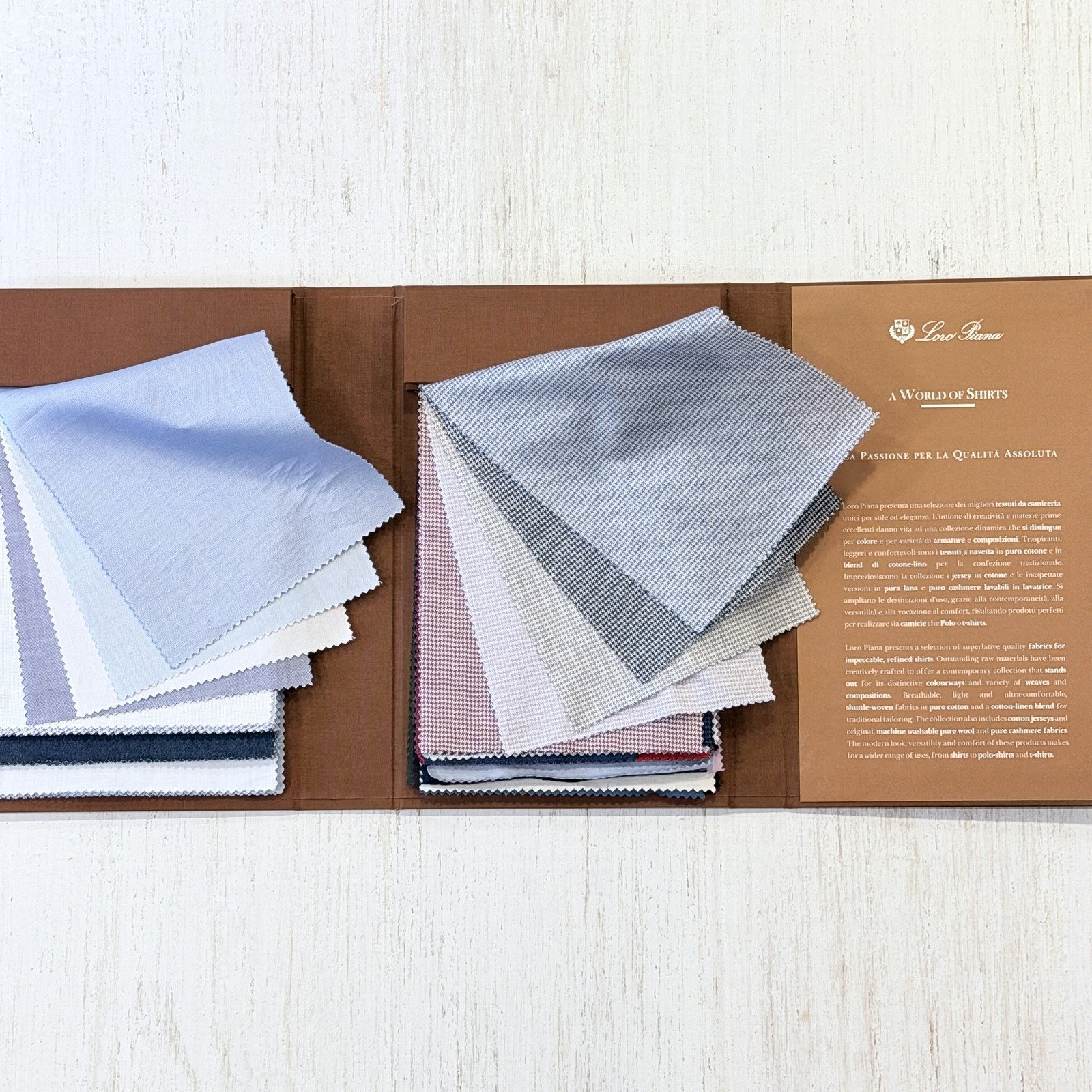 イタリアの高級生地メーカーのロロ・ピアーナ(Loro Piana)のシャツ生地は、コットンやコットン・リネンのクラシックな生地とウールやカシミヤなどのジャージー素材で70種類ほどの生地が収録されています。