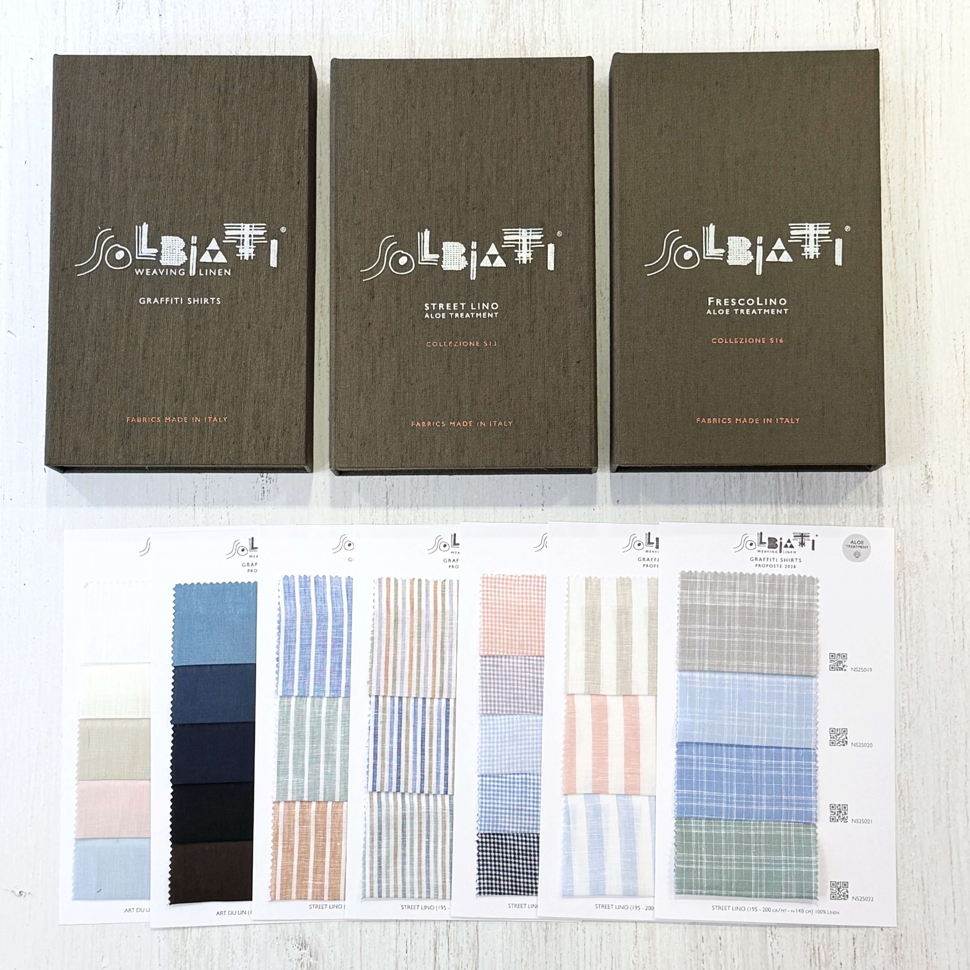 高級リネンメーカーのソルビアッティ(Solbiati)のシャツ生地は、最高品質のリネンとコットン・リネンで約200種類の生地が収録されています。