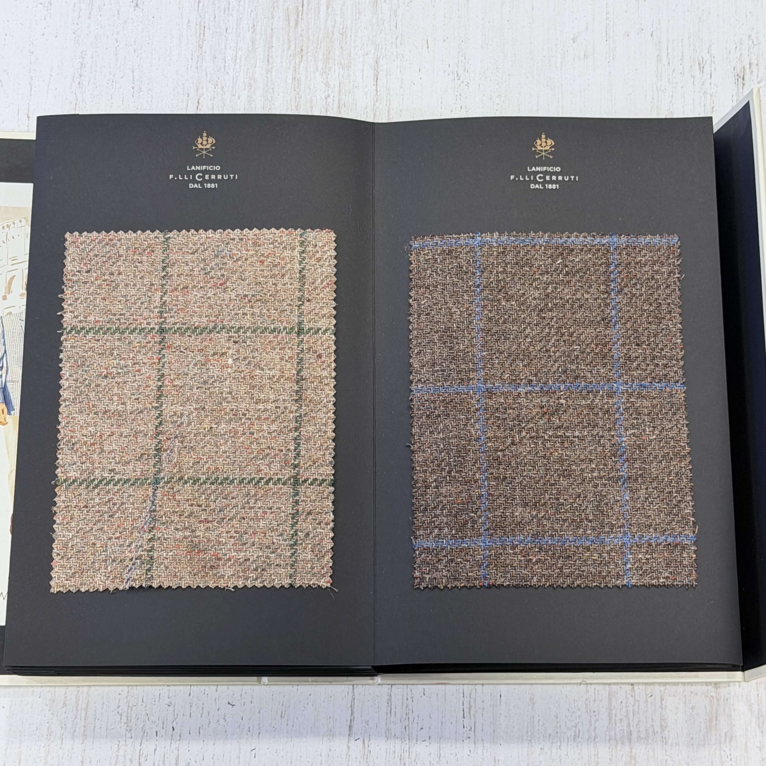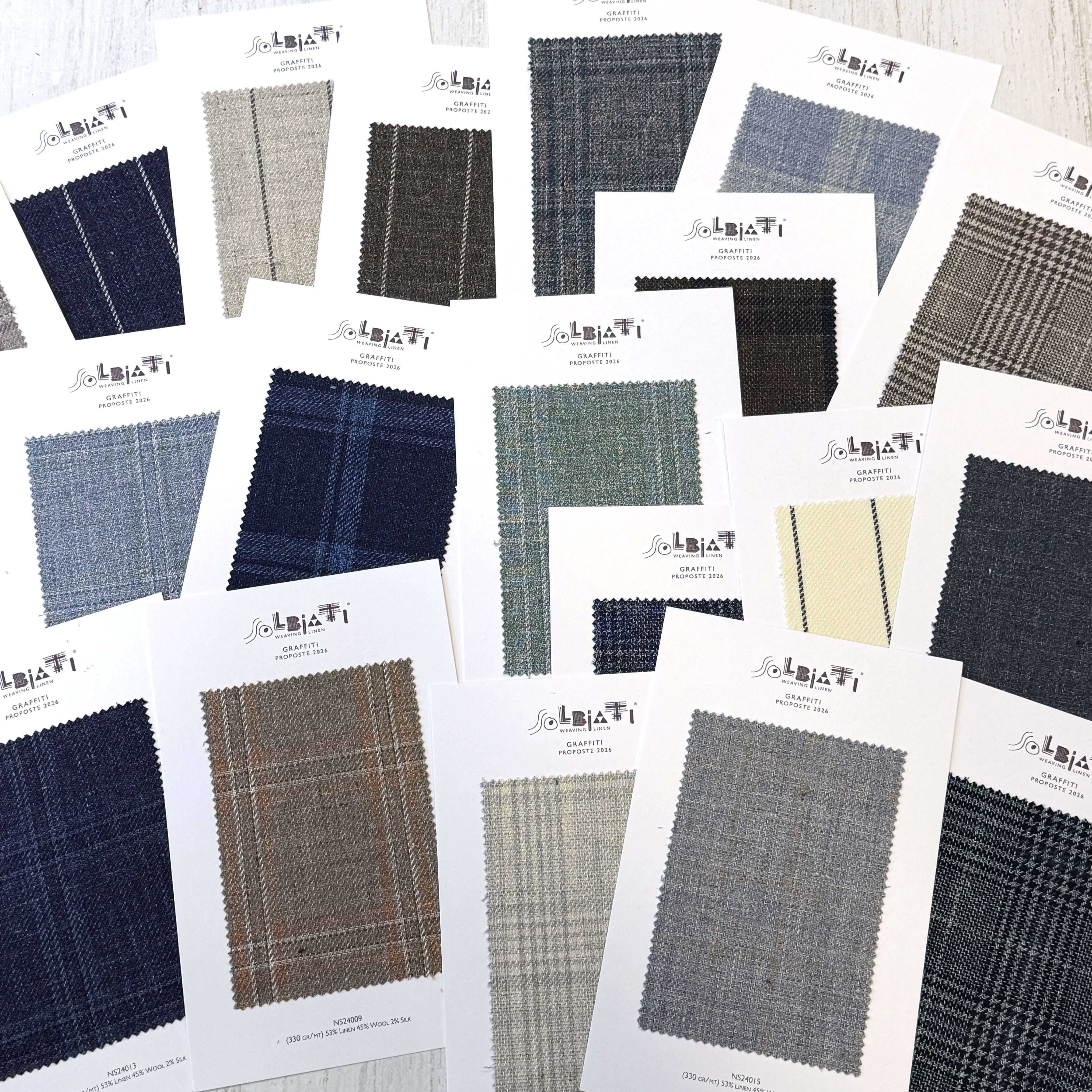 ズバリSUMMER TWEEDという名のバンチブックがございます。67%リネン・33%コットンで織られた生地は、ドライタッチでザックリとていながらも光沢もあります。無地・グレンチェック・ハウンドトゥース・ウインドペーンというクラシックな柄をファンシーな色で表現した生地は高い人気を誇ります。