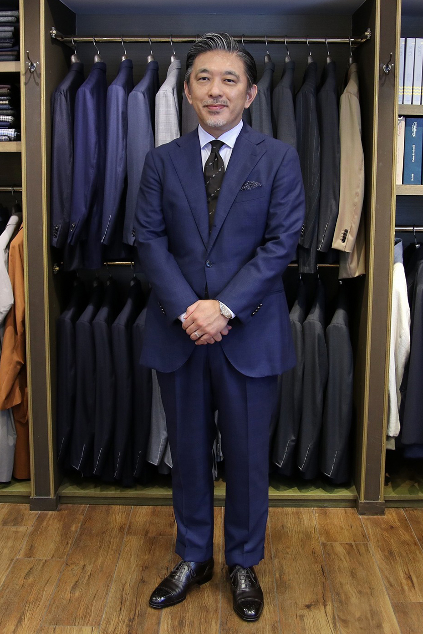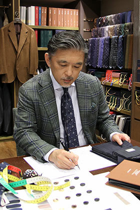テーラーやオーダースーツショップというお店は、いろいろな形態がございますが、私は、スーツやシャツなどをオーダーいただく際に、お薦めの生地やデザイン、スタイル、コーディネイトなどについてのご提案をし、お客様の身体を採寸し、体型の特徴を確認して最適なサイズやデザイン・仕様を工場や職人に指示を出すフィッター兼スタイリストでございます。
